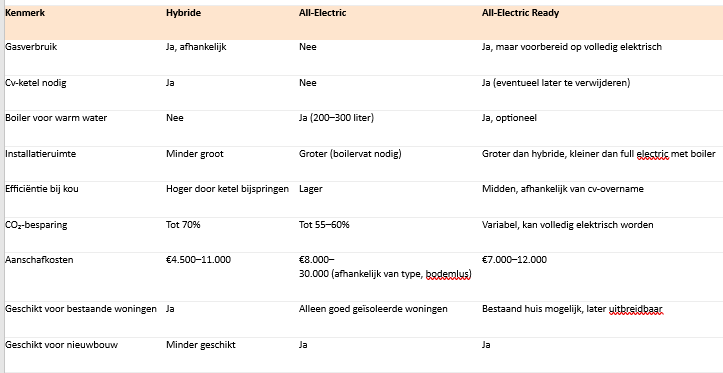 De keuze hangt af van woningtype, isolatie, verwarmingssysteem, budget en wens voor gasvrij wonen. Hybride is een transitieoplossing, all-electric een toekomstbestendige duurzame oplossing, en all-electric ready combineert flexibiliteit en een stap naar volledig elektrisch.
