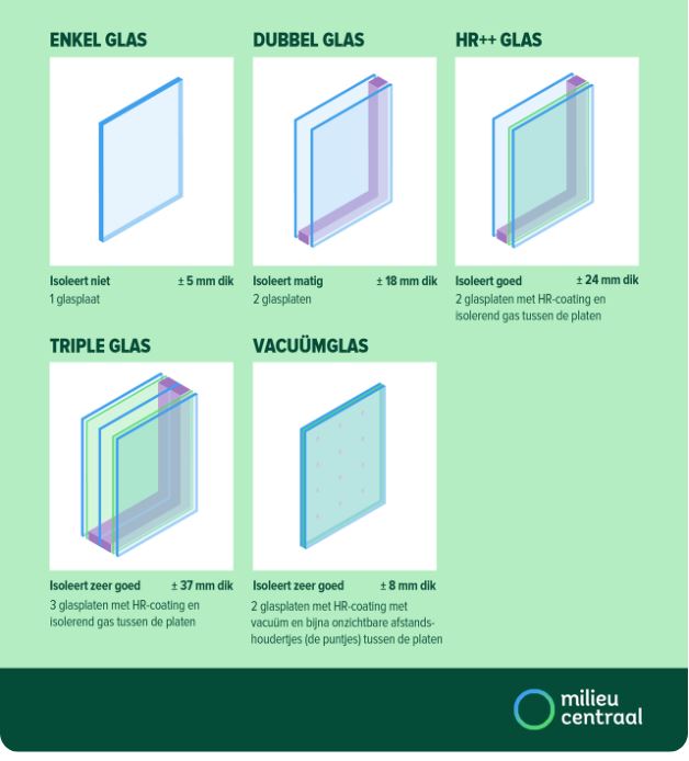 Eén glasplaat is voorzien van een speciale coating, die warmte binnenhoudt en kou buiten, waardoor de isolatiewaarde veel hoger is dan bij standaard dubbelglas.